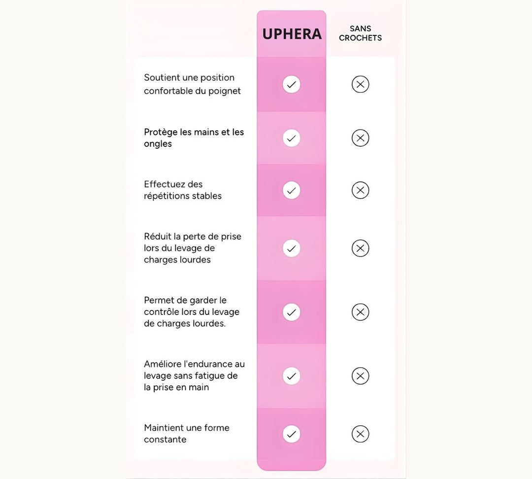 Contrairement aux sangles, les crochets Hera offrent une accroche instantanée et sécurisée sans avoir besoin de les enrouler autour de la barre. Ils sont plus rapides à mettre, plus confortables, et ne serrent pas les poignets.